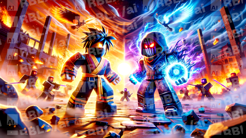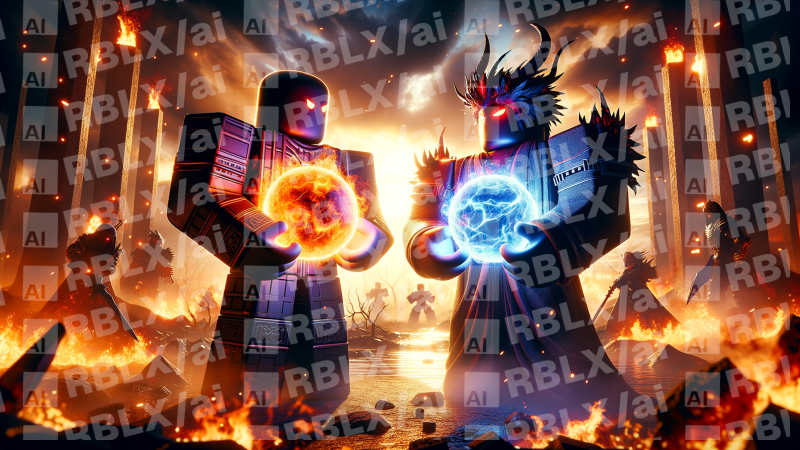 “Roblox thumbnail of two powerful warriors facing each other on a burning battlefield.