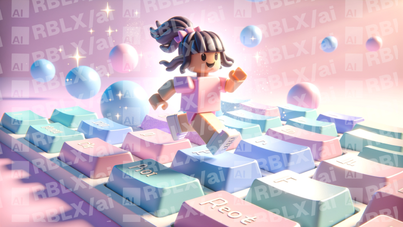 “girl running across a bunch of smooth buttons in pink, blue, and purple style. title is "pastel clicky keys"”