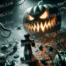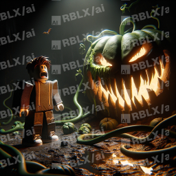“show a noob thats has a halloween plant in his plot it grows a giant pumpkin, 3d, realistic”