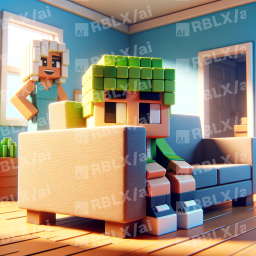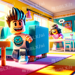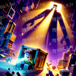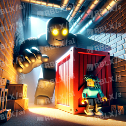 “A hide and seek roblox game icon, with a girl hiding while being searched for by a giant”