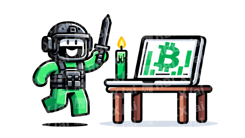 “Celebrating soldier wearing a ballistic helmet and a laptop on a desk behind him with huge green crypto-chart candle”