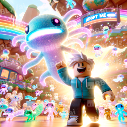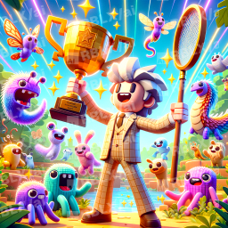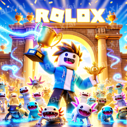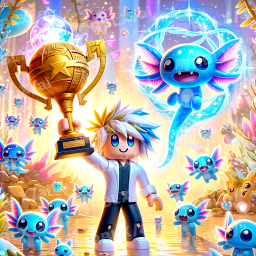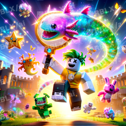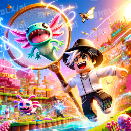 “A player with a classic bug net in one hand, and a trophy in the other, surrounded by many rare axolotls and brainrots with lots of sparkly VFX, and b...”