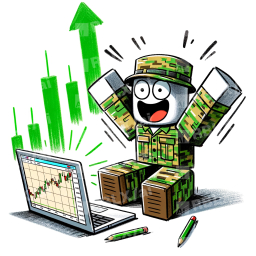 “A soldier sitting in front of a laptop, celebrating a huge green crypto-chart candle which is visible on the laptop”