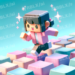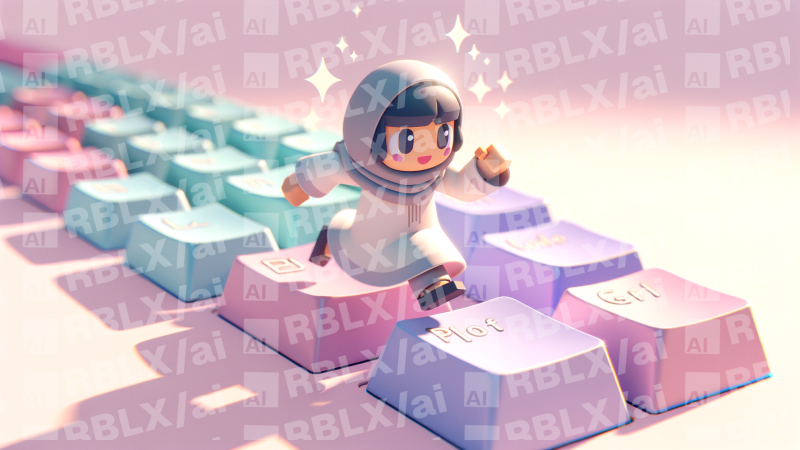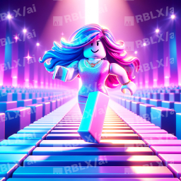 “girl running across long runway of smooth keys in pink, blue, and purple style”