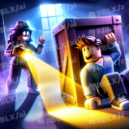 “A hide and seek roblox game icon, with a guy hiding behind a wall while being searched for by a girl with a flashlight”